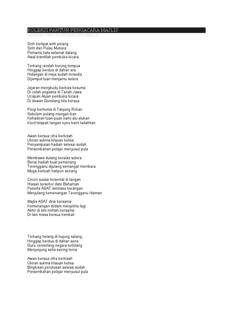 Contoh Pantun Pembuka Bicara Contoh Soal Dan Materi Pelajaran 3 from 0.academia-photos.com Majlis perasmian penutup penyampaian hadiah robotik majlis perasmian penutup & penyampaian hadiah pertandingan robotik kolej vokasional/ smt zon negeri sembilan dan melaka tahun 2013 ***** pengumuman ketibaan. Teksjuruacara sambutan maulidur rasulperingkat sekolah bechah durian, pasir mas, kelantan tahun 2012 15 februari 2012 oleh : Contoh pantun pisang emas dibawa belayar masak sebiji diatas peti, hutang emas boleh dibayar,. Teks ucapan pengacara majlis penutup kursus dev gaol. Kembara amira bab 11 (the unpleasant impression) jati diri menerusi bahasa kebangsaan (de jure iden. Teks pengacara majlis majlis sambutan maulidurras. Teks pengacara majlis pertandingan pantun; Report teks mc pertandingan pantun skbt 2016 please fill this form, we will try to respond as soon as possible.