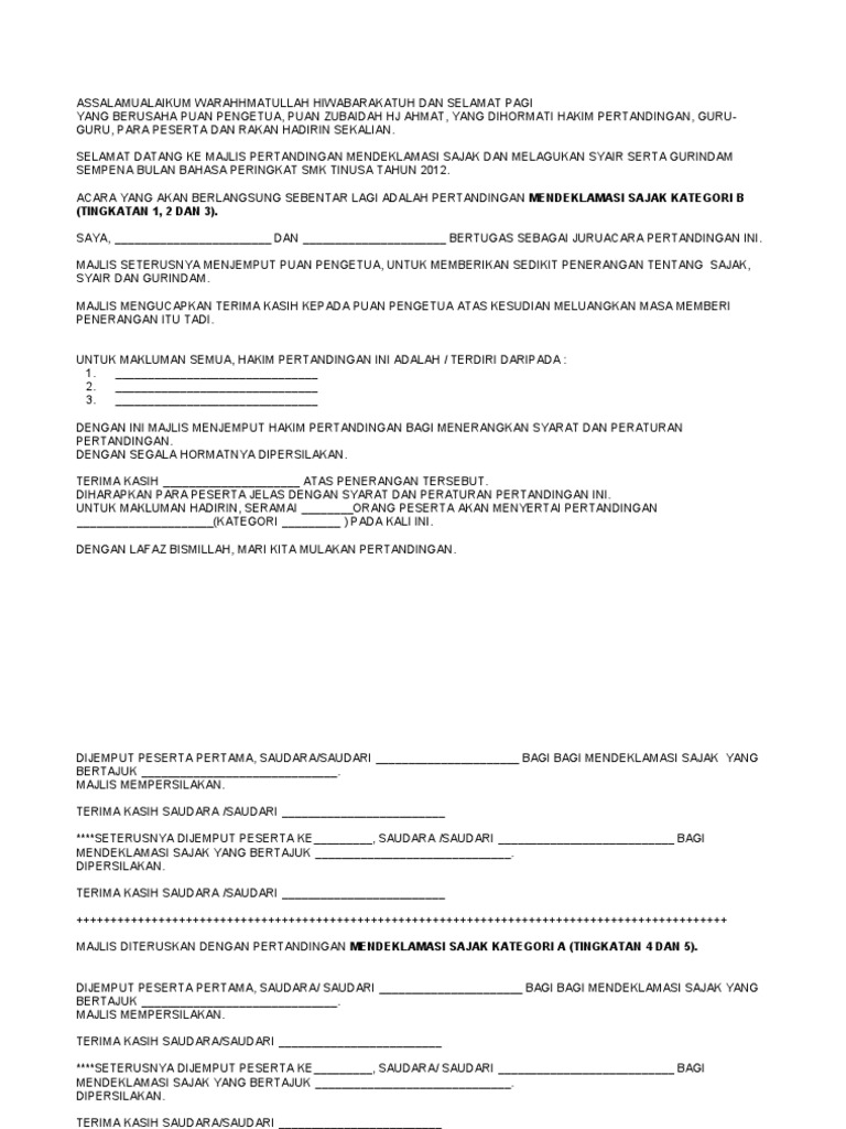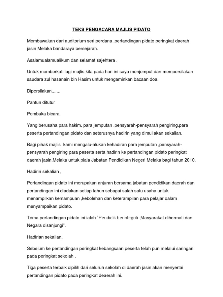 Teks pengacara majlis pidatomembawakan dari auditorium seri perdana ,pertandingan pidato peringkat daerah jasin melaka bandaraya bersejarah.asalamualamualikum Pantun di dalam buku ini disusun mengikut atur cara majlis. Pantun memainkan peranan untuk menarik perhatian hadirin yang menghadiri sesuatu majlis. Teks pengacara majlis kejohanan olahraga antara ti. Teks ucapan majlis penutup pertandingan contoh ii dubai khalifa.